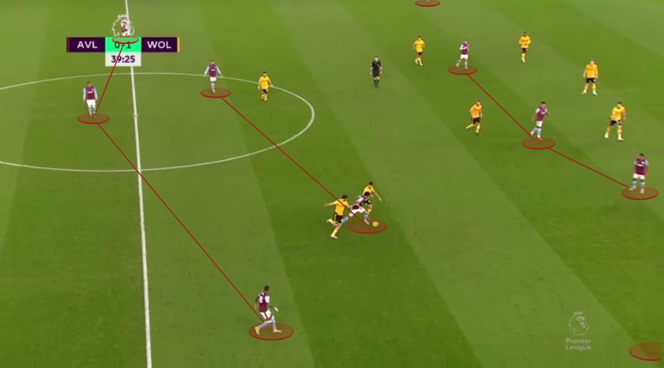 然而,最近这种对控制的追求变得过于谨慎,扼杀了进攻冒险精神。维拉在进攻组织阶段基本上仍然采用3-2-5阵型。这是8月对阵布伦特福德的比赛。