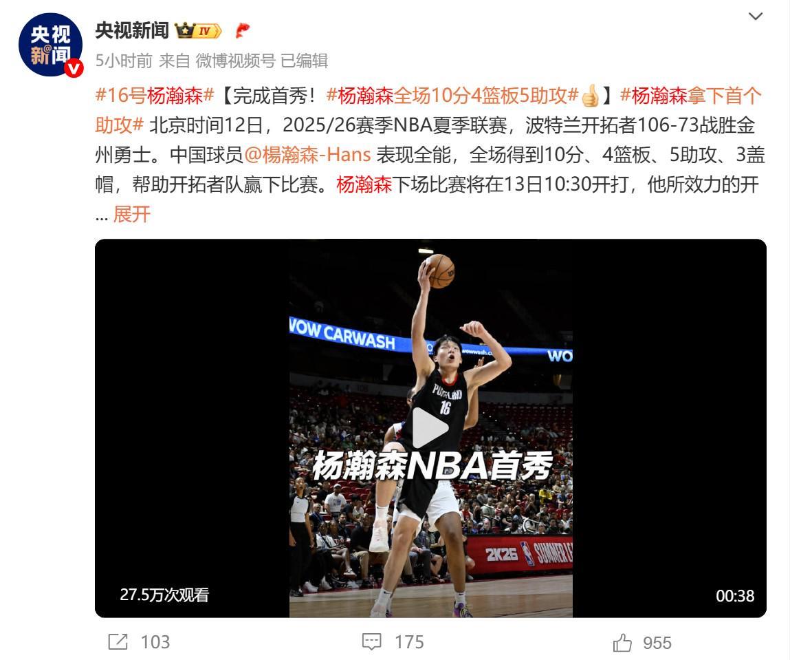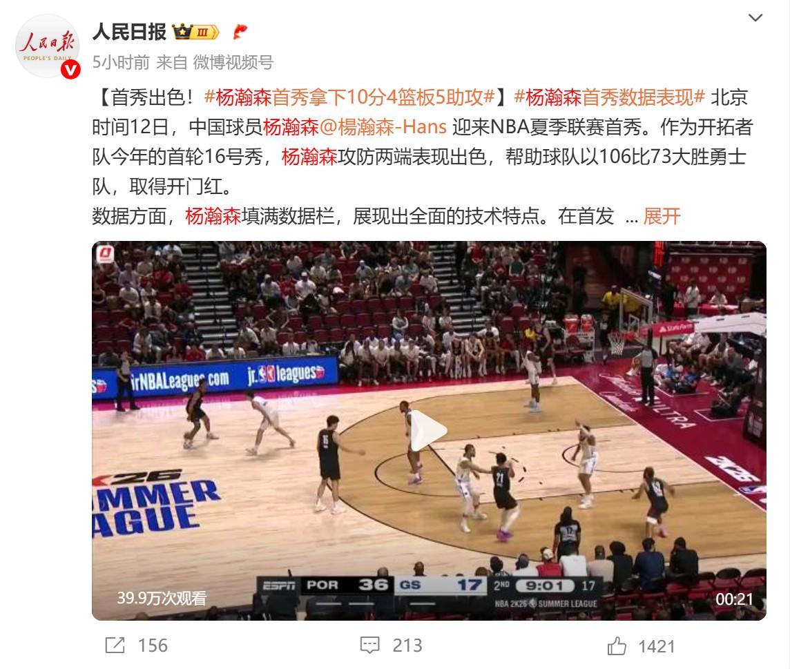 赛后,新华社、人民日报和央视新闻均转发报道杨瀚森的首秀,并向球员送上祝福。